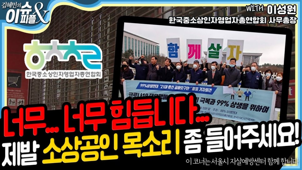 ◇ 김혜민> 함께 거리에서 싸워주겠다. 그 말이 정말 큰 위로가 됩니다. 우리 사무총장님이 여러 번 강조해 주셨는데요. 여러분들, 버티시고요. 도저히 버티기 힘들다, 하실 때 도움을 요청하세요. 서울시 자살예방센터 자살위기 상담전화 1577-0199, 힘들 때 전화하면 꼭 전화 받는 분이 계십니다. 여러분 통화하셔서 분명히 도와줄 방법이 있을 거예요. 통화하시고요. 한국중소상인자영업자총연합회, 여기는 어떻게 연락하면 돼요.