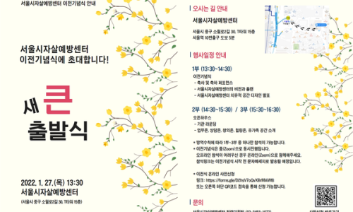 서울시자살예방센터는 27일 2022년 이전 기념식을 개최했다고 밝혔다. 서울시자살예방센터 이전기념식 ‘새 큰 출발식’은 코로나19 확산 방지를 위해 비대면 방식(유튜브)을 활용해 진행되며, 일부 대면 행사의 경우 백신접종 완료 증명서 확인 등 방역지침을 준수해 진행됐으며, 30여 개 유관기관에서 오프라인 및 온라인으로 참석했다. 이날 기념식에는 박유미 국장(서울시 시민건강국), 김인호 의장(서울시 의회), 백종우 회장(한국트라우마 스트레스 학회), 황정우 협회장(한국정신간강사회복지사협회), 오강섭 이사장(대한신경정신의학회), 황태연…