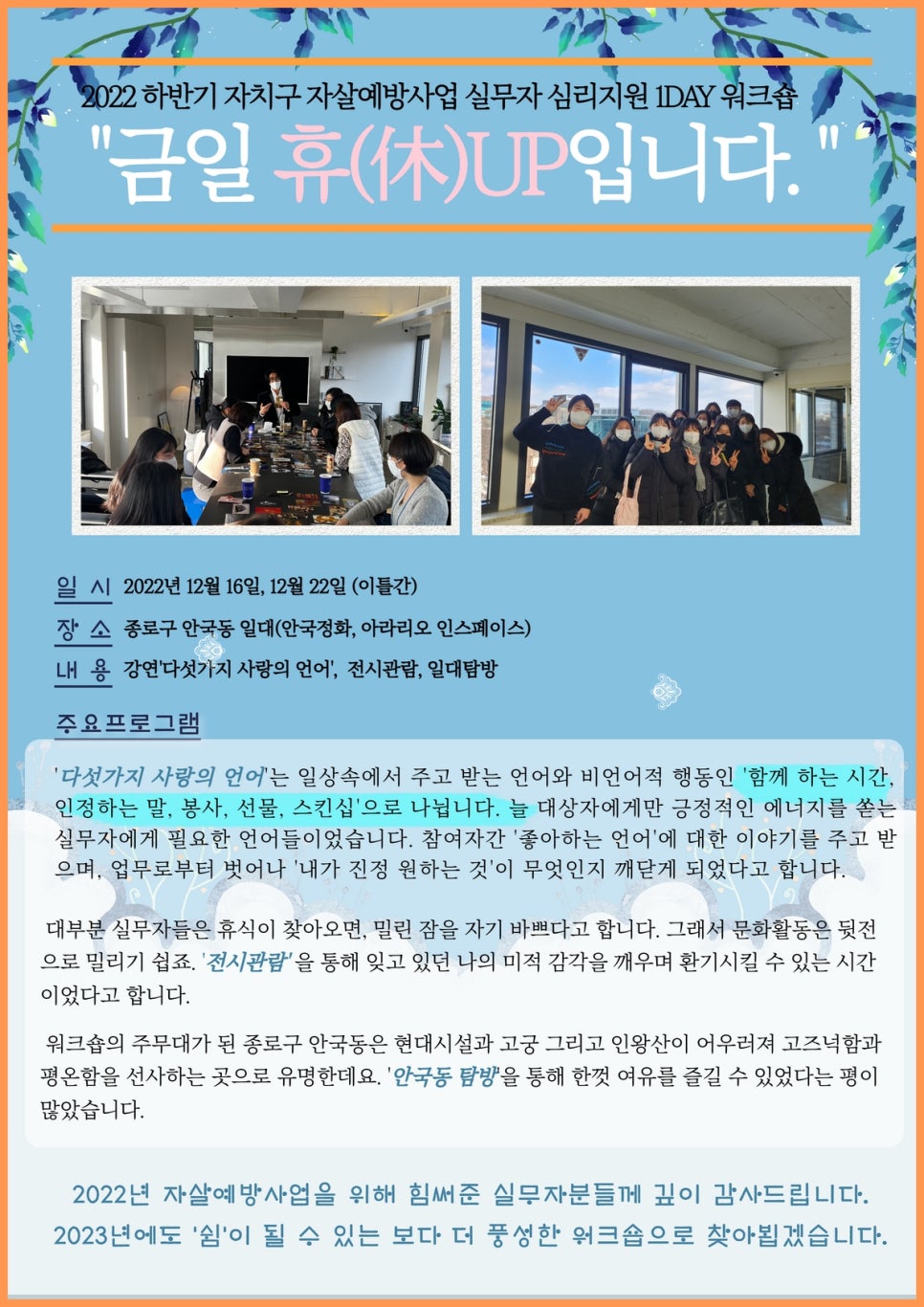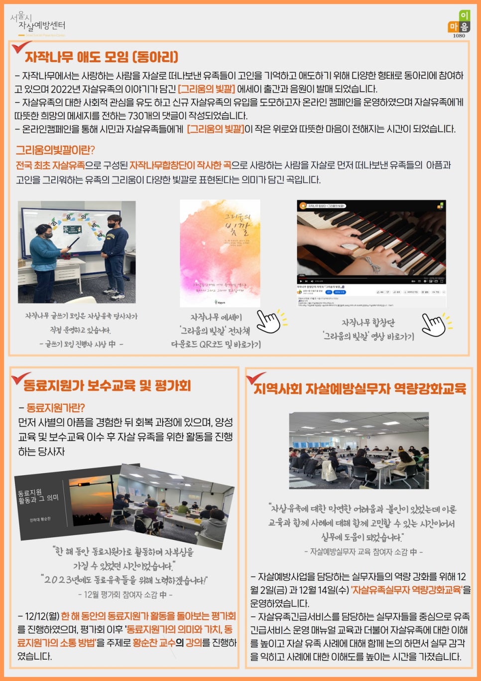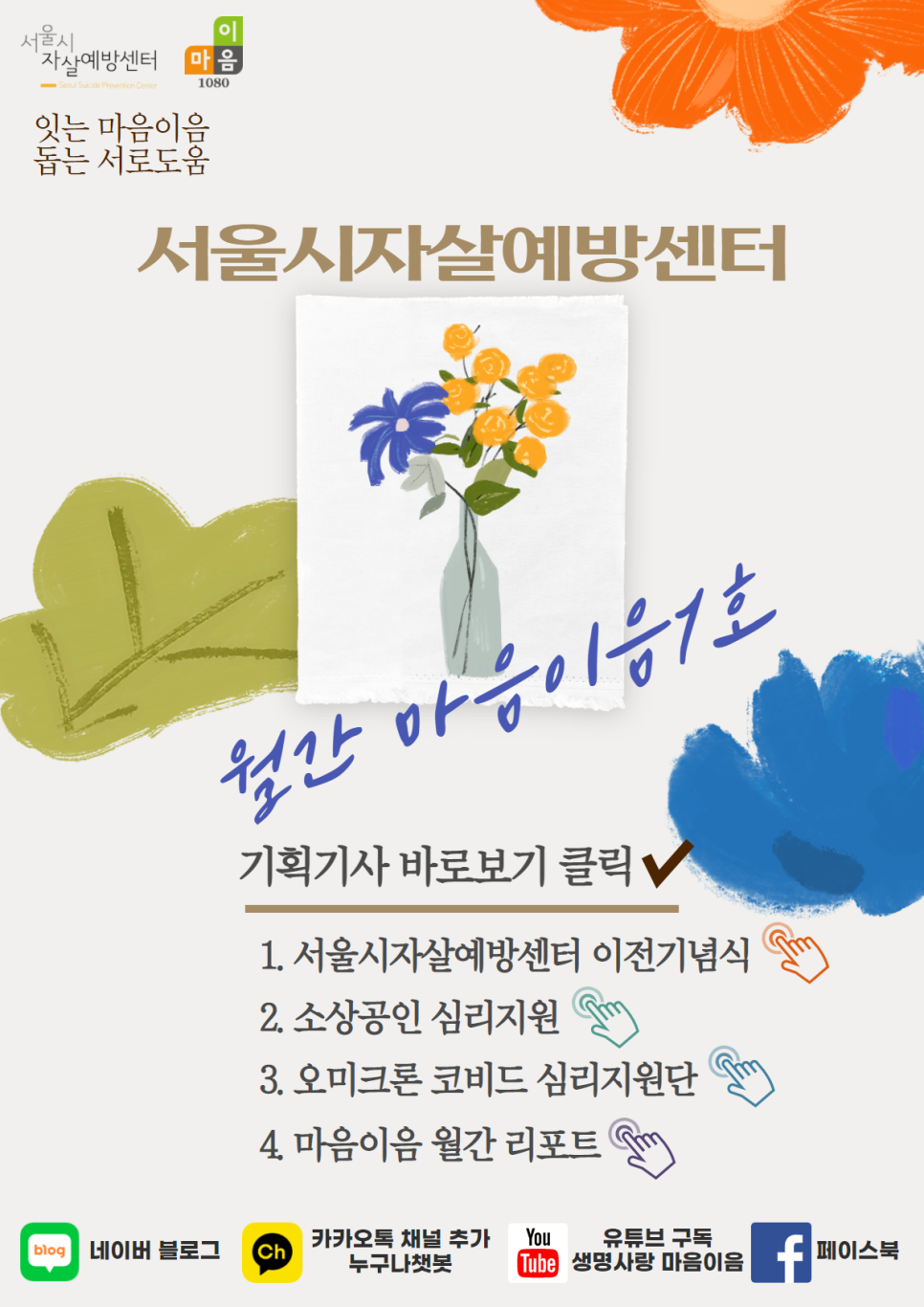 서울시자살예방센터 소식지 1호기준 서울시자살예방센터2023년 1월 18일2024년 12월 6일 서울시자살예방센터입니다. 자살예방과 생명존중 문화조성에 많은 관심을 가져주셔서 감사합니다. 2022년 서울시자살예방센터 소식지 1호 입니다. 아래 소식지 1호 링크 클릭을 통해 더 편리한 소식지를 보실 수 있습니다. 서울시자살예방센터 소식지 1호.pdf 서울시자살예방센터 소식지 1호.pdf Sign In drive.google.com