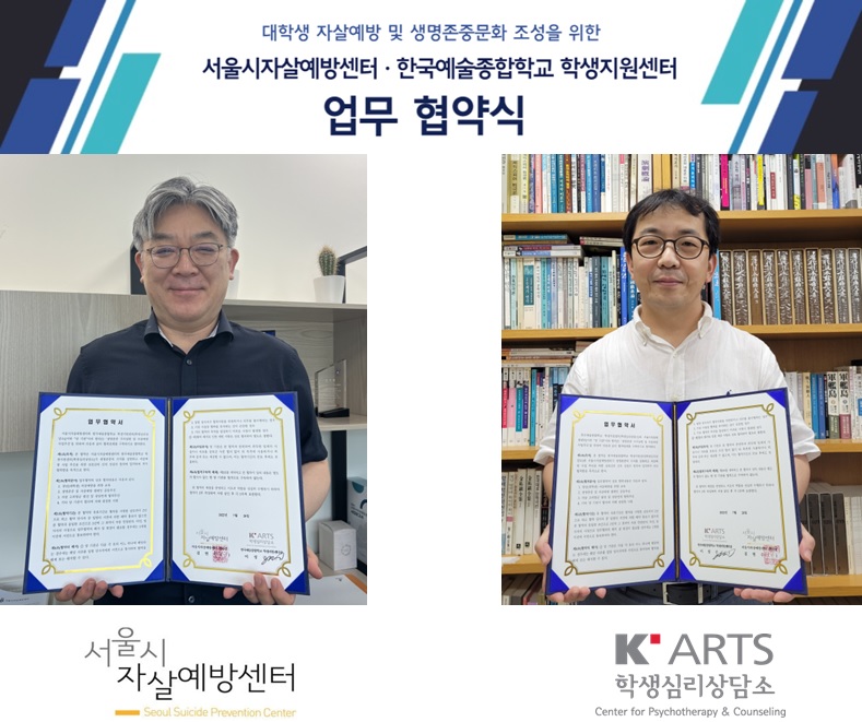 서울시자살예방센터, 한국예술종합학교 학생지원센터 업무 협약 체결기준 서울시자살예방센터2022년 8월 17일2024년 12월 11일 2022년 7월 28일 (목) 대학생 자살예방 및 생명존중문화 조성 을 위해 서울시자살예방센터 와 한국예술종합학교 학생지원센터 가 업무 협약을 체결했습니다. 앞으로 양 기관은 협력관계를 구축하고 대학생 자살예방을 위한 교육, 생명존중 및 자살예방 캠페인 추진, 자살 고위험군 발견 및 상담연계 등 다양한 협력을 진행해나갈 예정입니다. 서울시자살예방센터와 한국예술종합학교 학생지원센터의 활동을 기대해주세요.