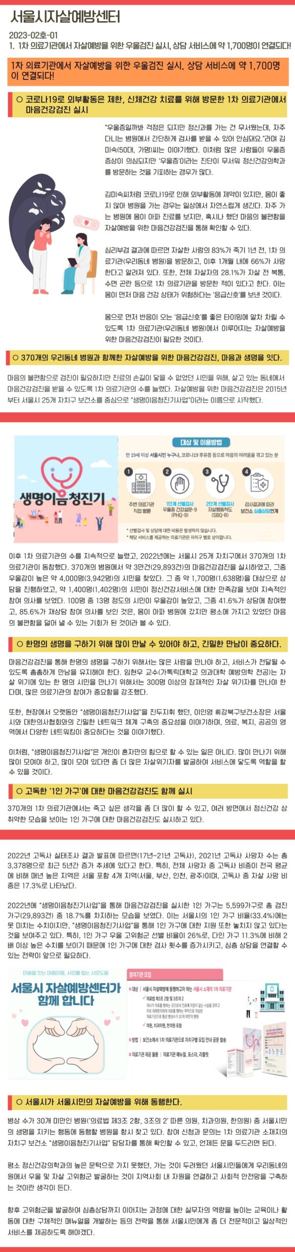 [서울시자살예방센터]2023-02호-01 기획기사”1차 의료기관에서 자살예방을 위한 우울검진 실시, 상담 서비스에 약 1,700명이 연결되다!기준 서울시자살예방센터2023년 3월 22일2024년 12월 6일
