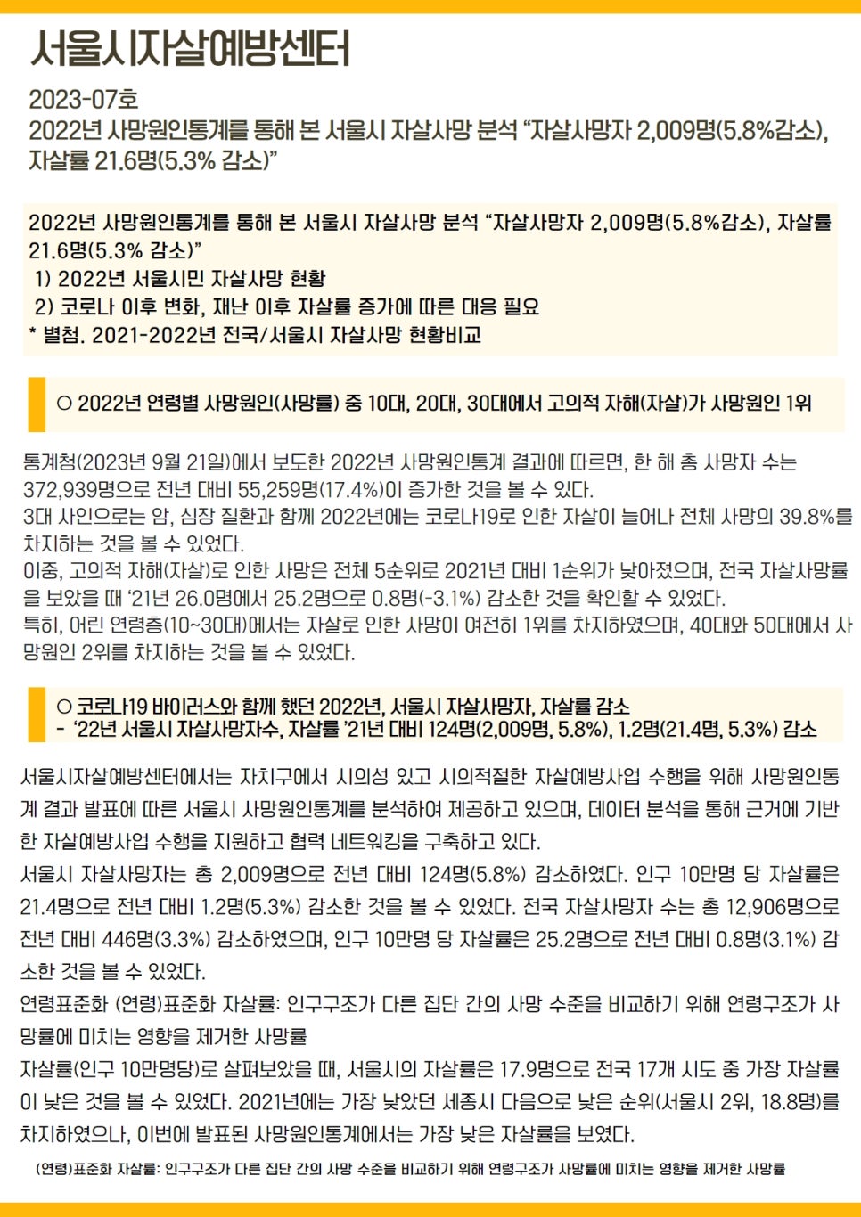 [서울시자살예방센터]2023-07호 기획기사 2022년 사망원인통계를 통해 본 서울시 자살사망 분석