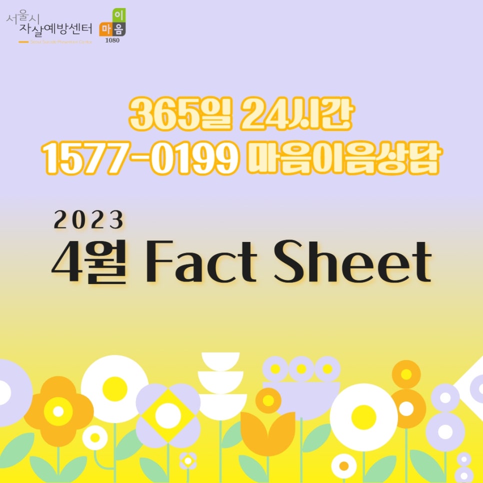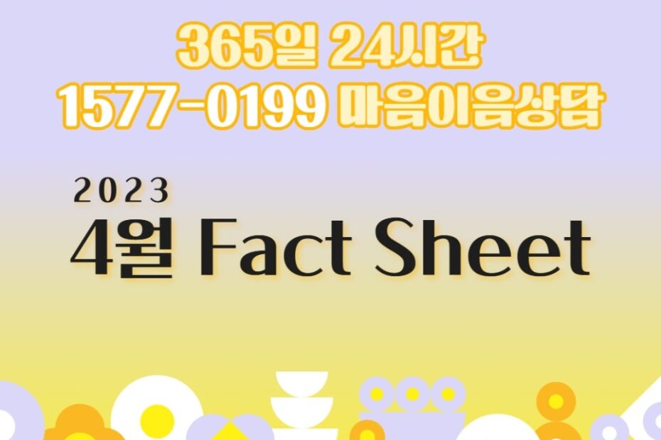 [서울시자살예방센터]2023-3호 Fact sheet 기준 서울시자살예방센터2023년 5월 15일2024년 12월 6일 안녕하세요! 서울시자살예방센터입니다. 365일 24시간 운영되고 있는 1577-0199 마음이음상담전화 4월 fact sheet 입니다. 서울시 자살예방에 대한 많은 관심 부탁드립니다??