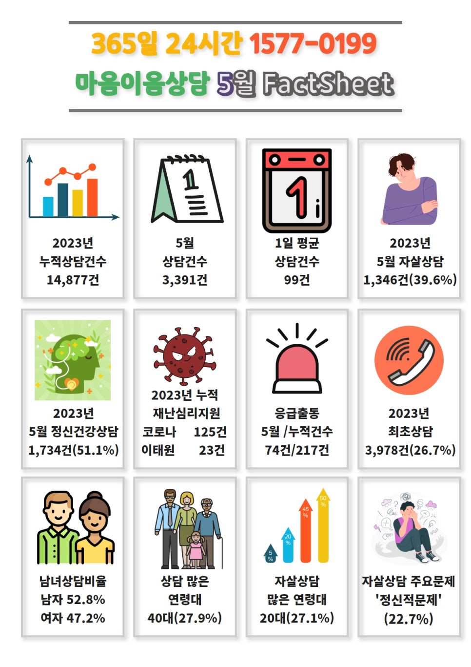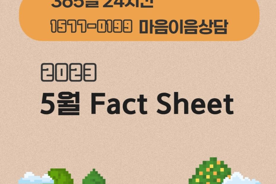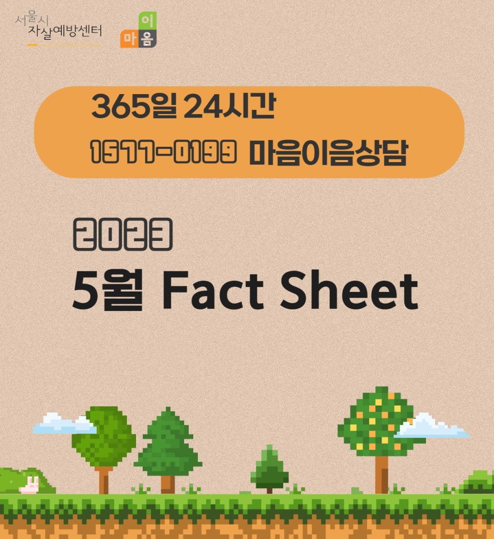 [서울시자살예방센터]2023-4호 Fact sheet 기준 서울시자살예방센터2023년 6월 30일2024년 12월 6일 안녕하세요! 서울시자살예방센터입니다. 365일 24시간 운영되고 있는 1577-0199 마음이음상담전화 5월 fact sheet 입니다. 5월 한달 동안 많은 시민분께서 1577-0199를 이용해 주셨습니다. 서울시민의 생명을 돌보는 마음이음상담 전화 (1577-0199) 서울시 자살예방에 대한 많은 관심 부탁드립니다??