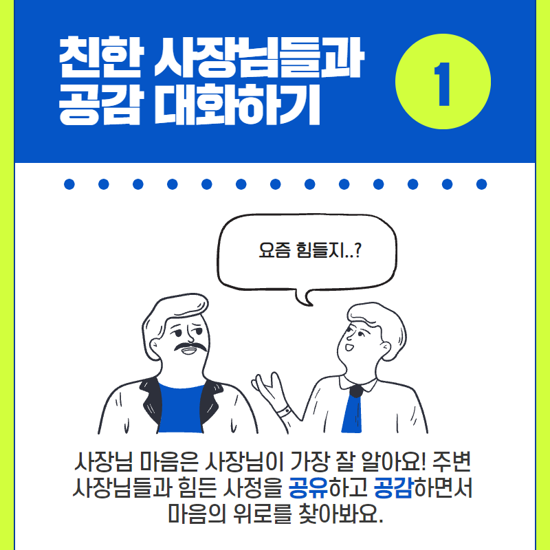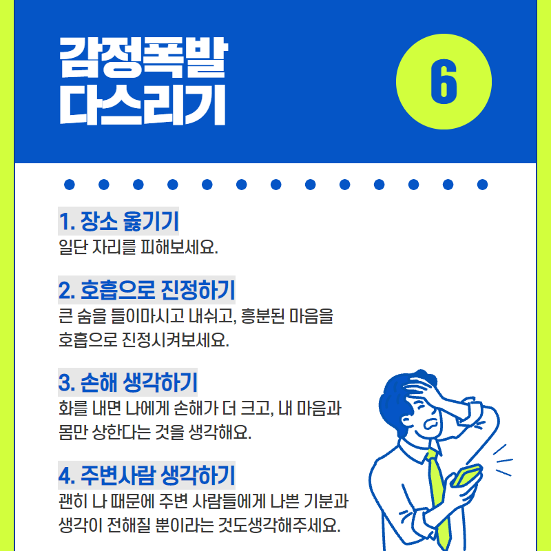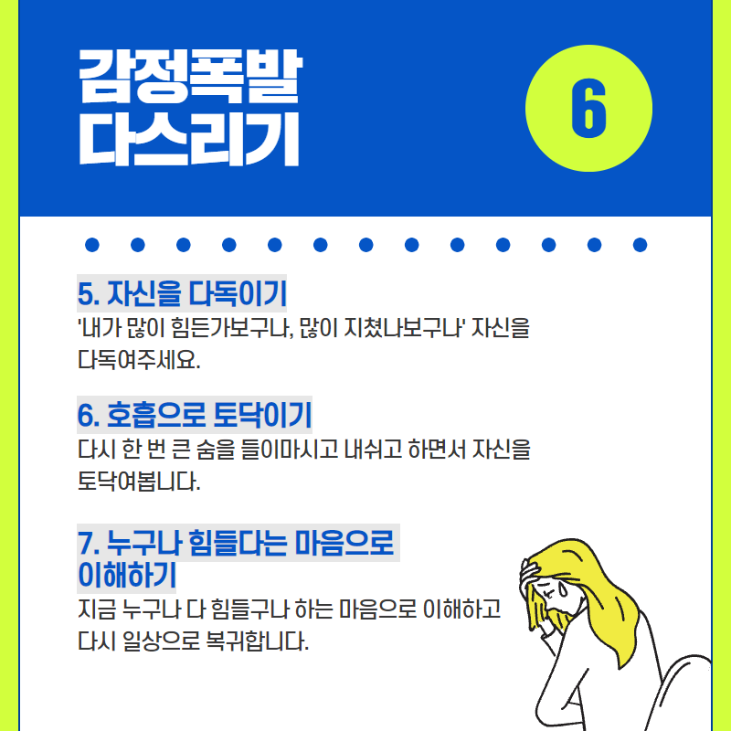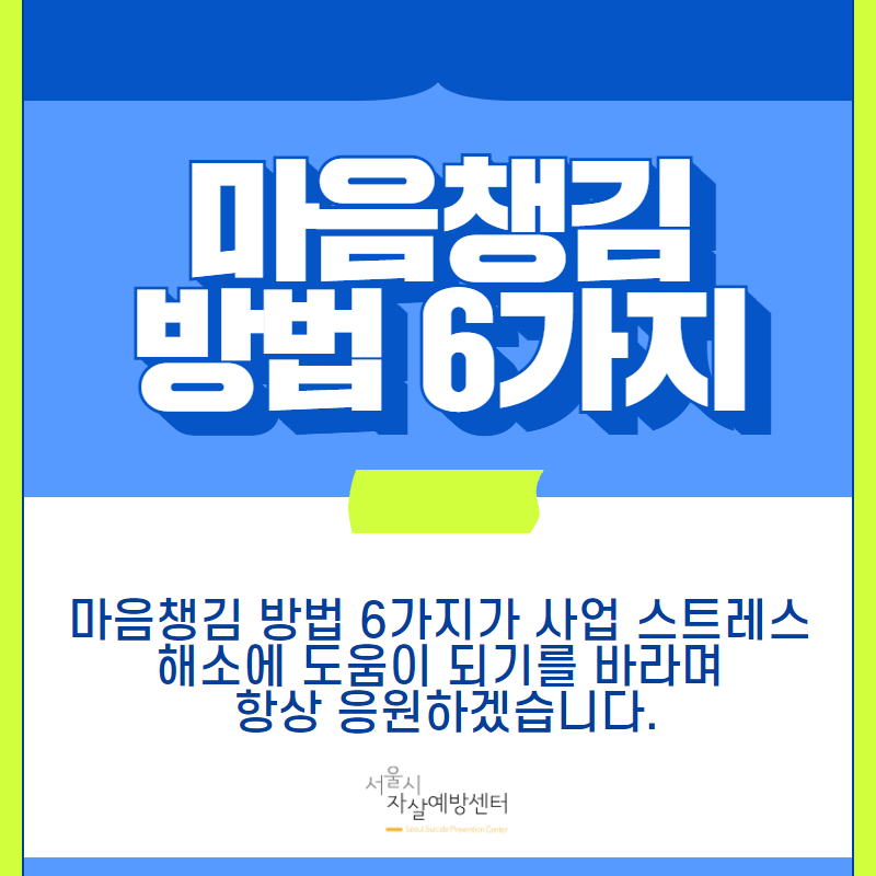 [소상공인자살예방사업]소상공인 심리지원 ‘마음챙김 방법 6가지’기준 서울시자살예방센터2021년 12월 14일2024년 12월 6일 소상공인 자살예방사업 소상공인 심리지원을 위한 콘텐츠 서울시자살예방센터에서 코로나19의 장기화로 어려움을 겪고 있는 소상공인 분들에게 정서적 지지 와 심리지원정보 를 제공합니다. 심리적 위기에 있는 소상공인을 위한 마음챙김 6가지 방법입니다.