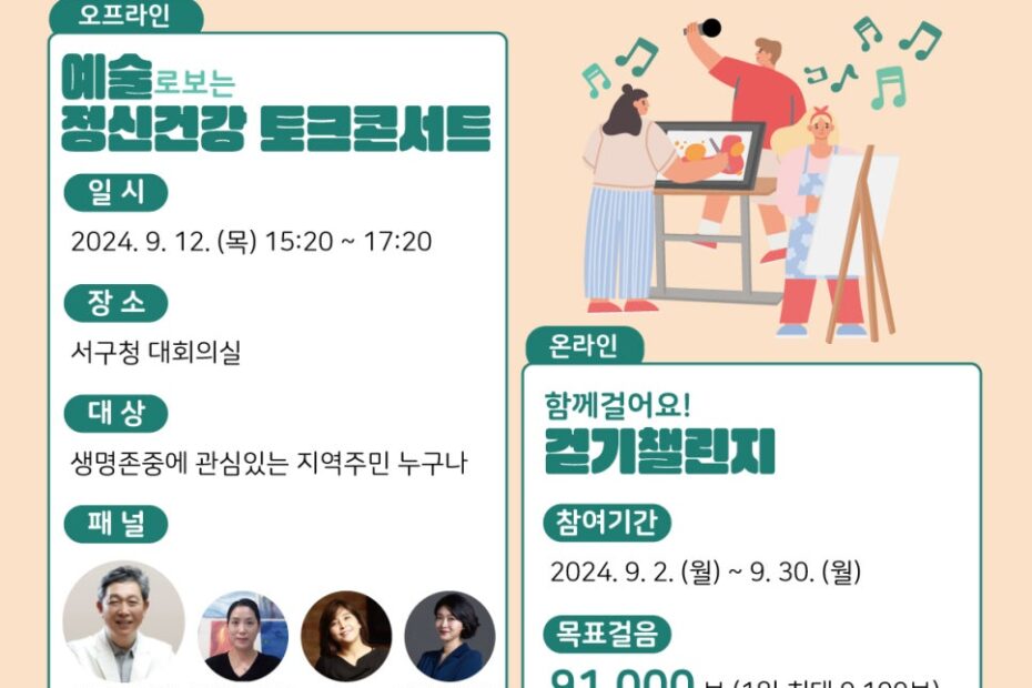 [인천서구정신건강복지센터] 2024년 자살예방의 날 기념행사 안내기준 서울시자살예방센터2024년 8월 22일2024년 12월 6일 안녕하세요, 서울시자살예방센터입니다! 인천서구정신건강복지센터에서 9월 10일 세계 자살예방의 날 을 맞이하여 비대면(온라인 걷기 챌린지) 와 대면(예술로 보는 정신건강 토크콘서트) 를 진행합니다~! 생명존중에 관심있는 누구나 참여 가능하오니 구체적인 내용이 궁금하신 분들은 아래의 포스터를 확인해 주세요. : ) 감사합니다!