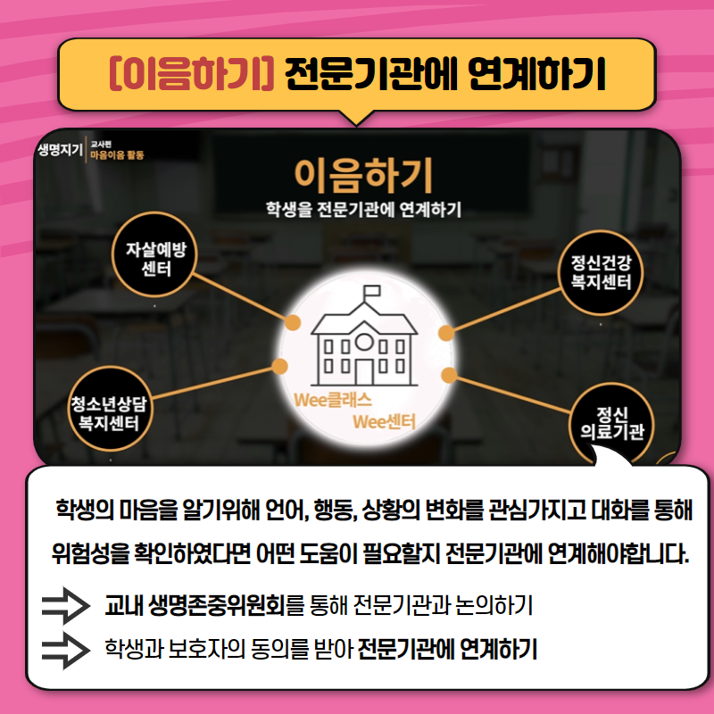 -> 교내 생명존중위원회를 통해 전문기관과 논의하기