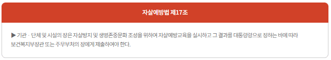 2024년 7월 자살예방법 개정에 따라 공무원, 공공기관 및 사회복지 시설 종사자 등 여러 대상에 자살예방교육 의무화가 되었습니다.