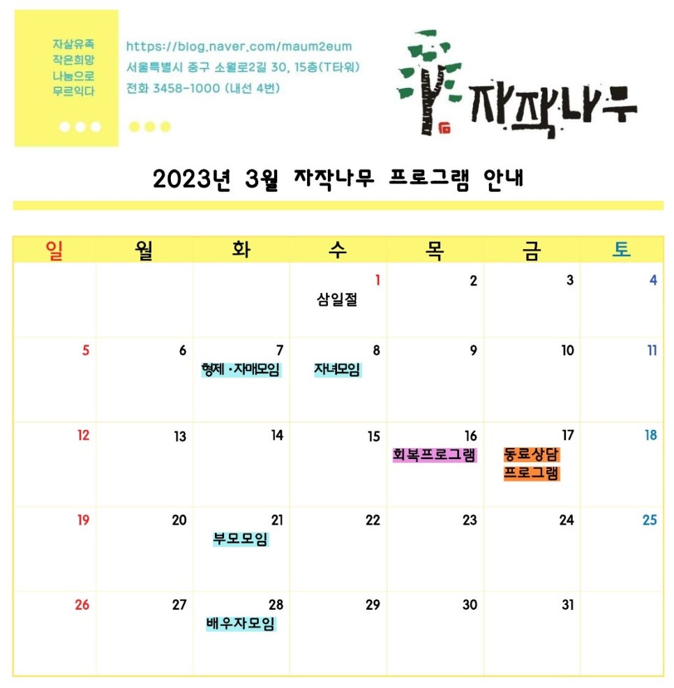 자작나무 여러분들과 함께 할 3월 프로그램 일정을 안내드립니다.