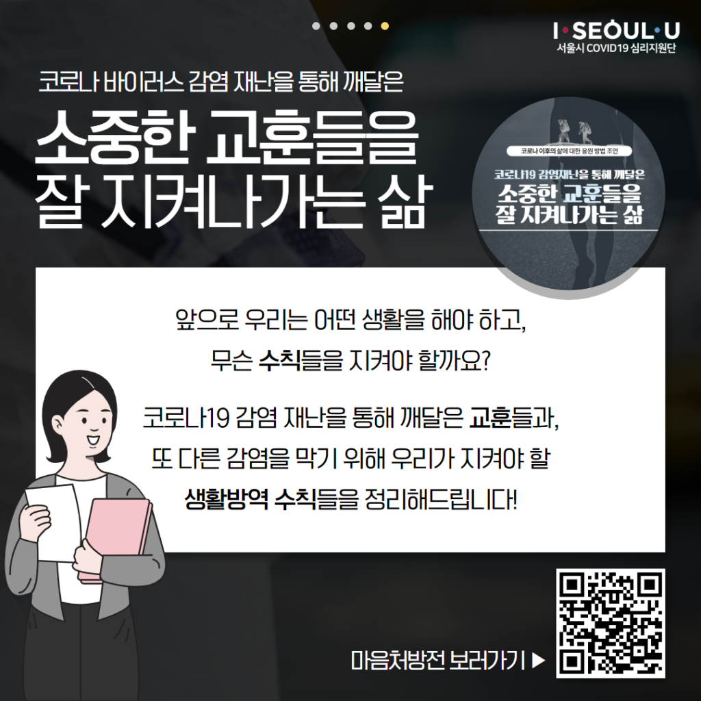 코로나 바이러스의 장기화로 인해 우울하고 무기력해졌거나, 혹은 지겹고 피로한 마음으로 느슨해진 여러분에게 도움이 될 수 있는 서울시covid19심리지원단의 콘텐츠 5가지를 소개해드립니다!