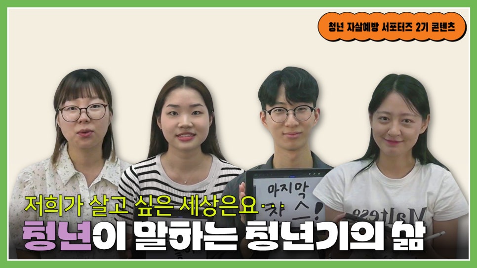 [청년 인터뷰] ‘청년이 말하는 청년기의 삶’기준 서울시자살예방센터2023년 10월 5일2024년 12월 6일 * 이 영상은 서울시자살예방센터 2023년 청년 자살예방 서포터즈 2기가 직접 기획하고 제작한 영상입니다.