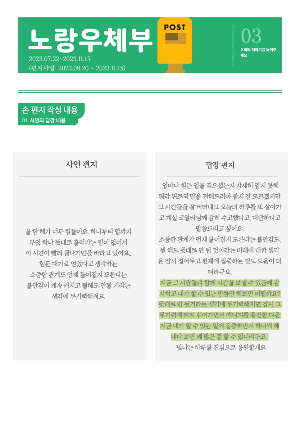 [청년 자살예방 서포터즈 2기] 노랑우체부팀 뉴스레터 2편기준 서울시자살예방센터2023년 11월 22일2024년 12월 6일 안녕하세요 서울시자살예방센터 전략팀입니다 ! 청년 자살예방 서포터즈 2기 마음이음 또래대화 노랑우체부팀에서 ‘대나무숲에서 온 편지’ 활동을 마무리하며 뉴스레터 2편을 제작했는데요, 노랑우체부팀의 자세한 활동 여정과 손편지 답신 내용은 아래의 뉴스레터를 통해 확인해주세요 ! 추운 날씨에 노랑우체부팀의 따듯한 손편지 내용으로 마음만은 따듯한 하루 보내시길 바랍니다 ? 앞으로의 청년 자살예방 서포터즈 2기 활동에도 많은 관심과 응원 부탁드립니다 !