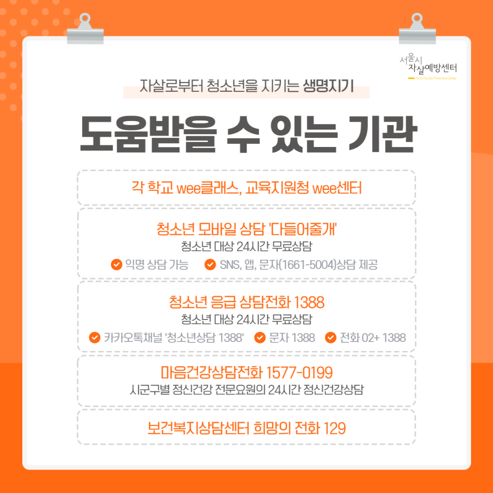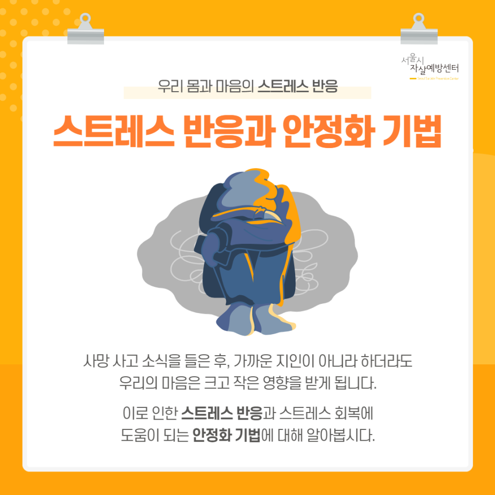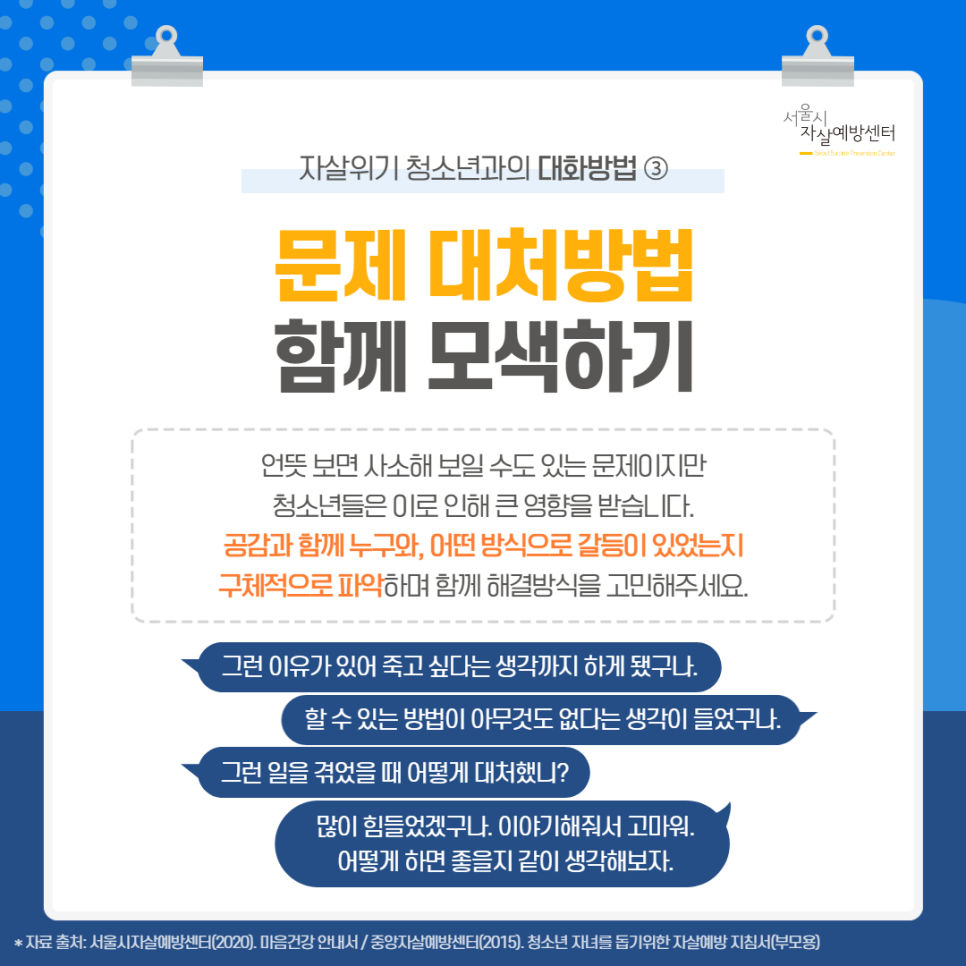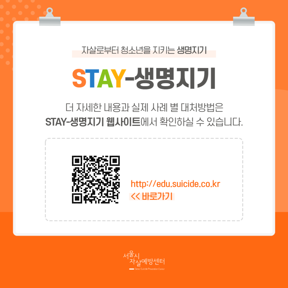 ✔ 내용을 요약해서 소개하거나 일부를 인용할 수 있으나 정보의 출처를 명확하게 하고 전체 내용을 파악할 수 있도록 출처(서울시자살예방센터) 및 원문 링크를 기재해 주시기 바랍니다.