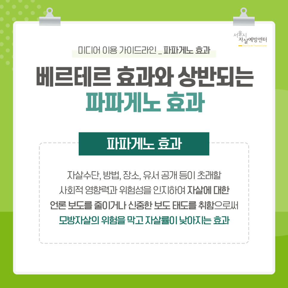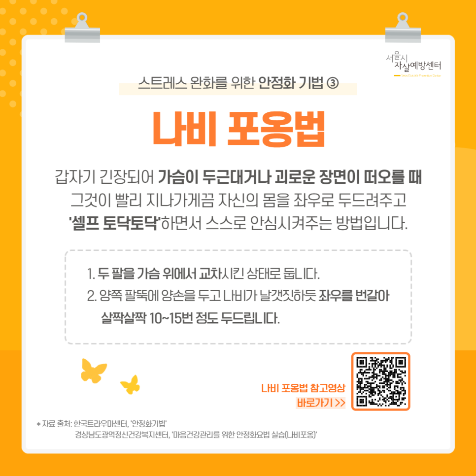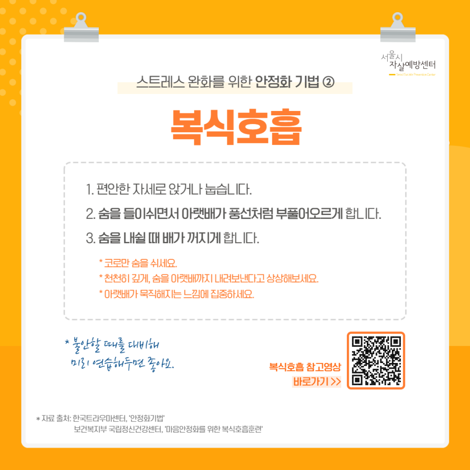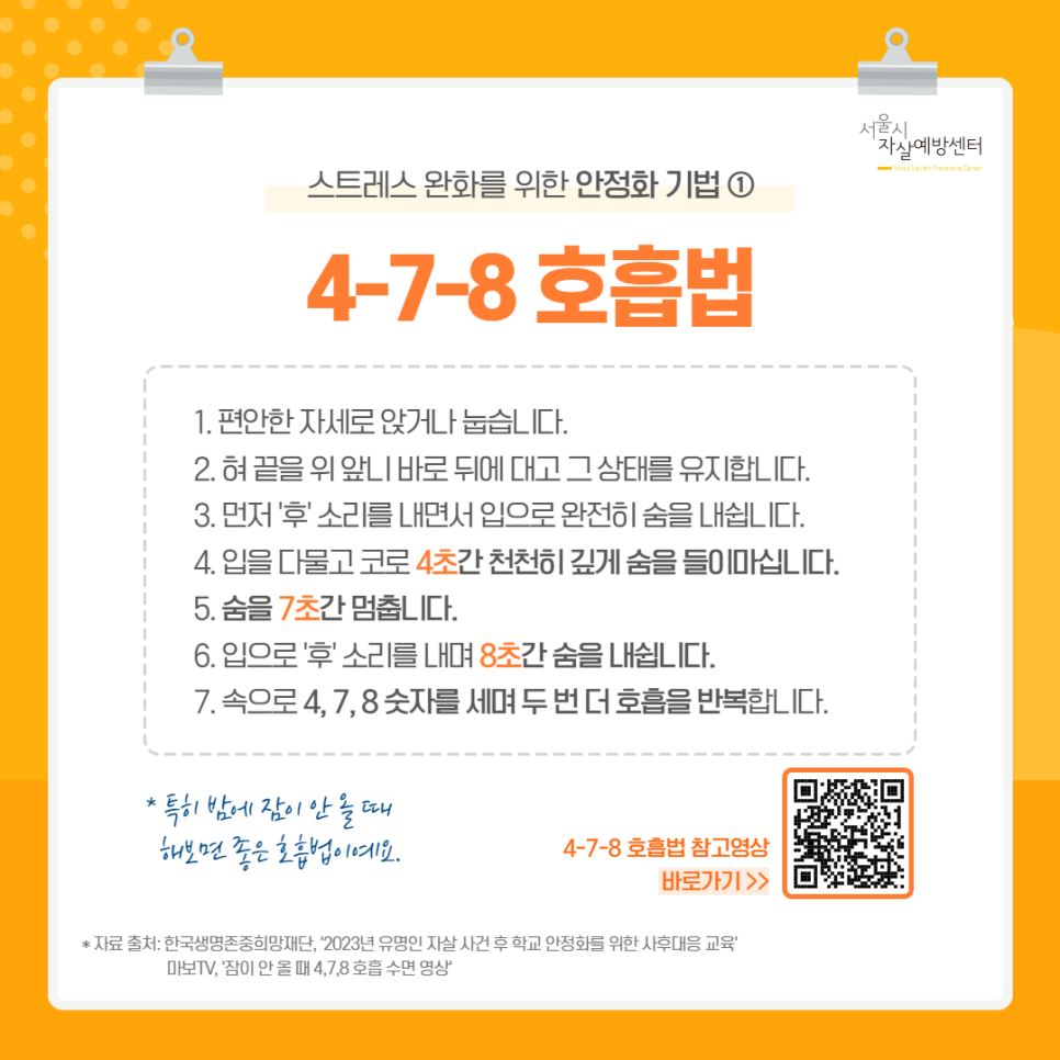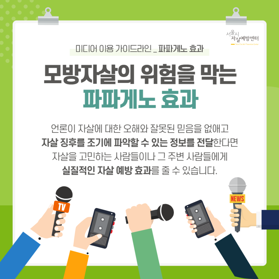 ✔ 내용을 요약해서 소개하거나 일부를 인용할 수 있으나 정보의 출처를 명확하게 하고 전체 내용을 파악할 수 있도록 출처(서울시자살예방센터) 및 원문 링크를 기재해 주시기 바랍니다.