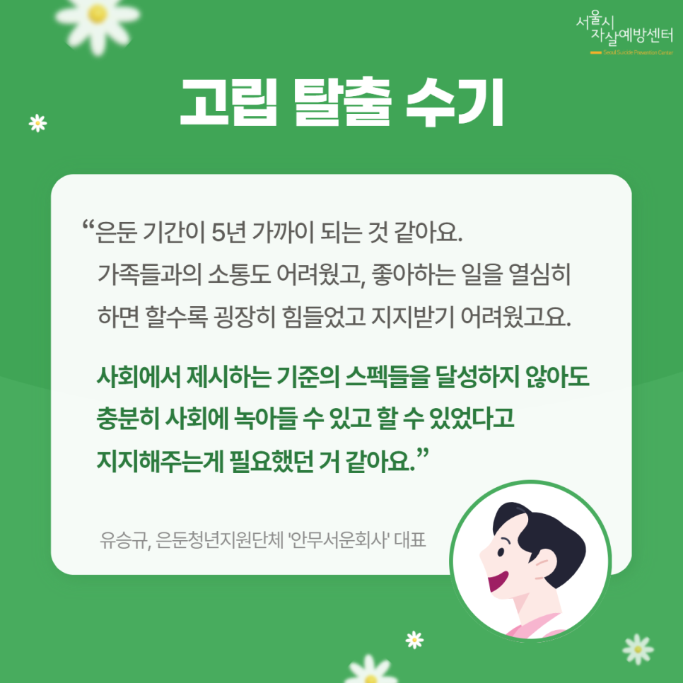 ✔ 서울시자살예방센터에서 제작된 콘텐츠는 공익적인 사용만 가능하며, 상업적 이용은 불가능합니다.