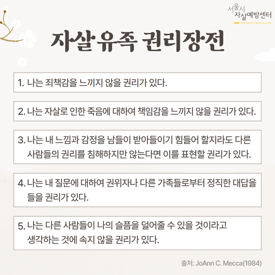 ✔ 내용을 요약해서 소개하거나 일부를 인용할 수 있으나 정보의 출처를 명확하게 하고 전체 내용을 파악할 수 있도록 출처(서울시자살예방센터) 및 원문 링크를 기재해 주시기 바랍니다.