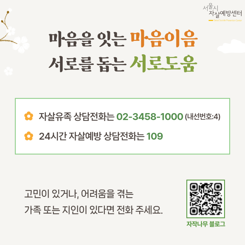 서울시자살예방센터 교육지원팀입니다.