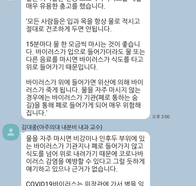 바이러스가 위에 들어가면 위산에 의해 바이러스가 죽게 됩니다. 물을 자주 마시지 않는 경우에는 바이러스가 기관(폐로 통하는 숨길)을 통해 폐로 들어가게 되어 매우 위험해 집니다.’