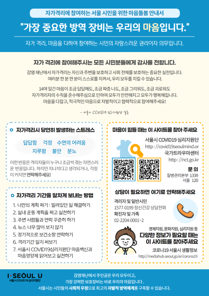 자가격리에 참여하는 서울 시민을 위한 마음돌봄 안내서기준 서울시자살예방센터2020년 9월 29일2025년 1월 14일1개의 댓글 태그:뉴스레터코로나코로나19코비드19 “자가격리에 참여하는 서울 시민을 위한 마음돌봄 안내서”의 1개의 댓글 핑백: [추석특집] 넉넉하고 풍성한 심리안정 선물세트 - 서울시 covid19 심리지원단 답글 남기기이메일 주소는 공개되지 않습니다. 필수 필드는 *로 표시됩니다이름 이메일 웹사이트 댓글 *
