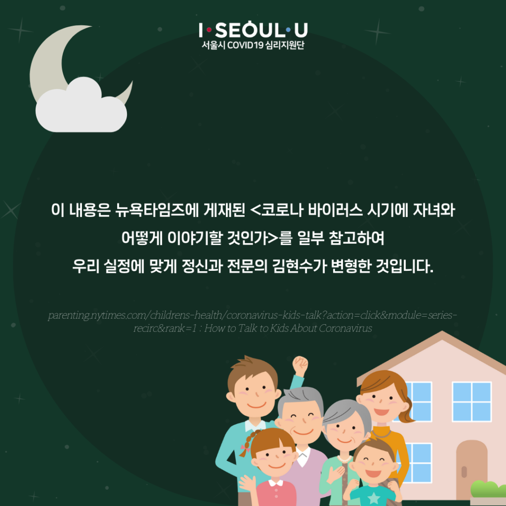 —- 이 내용은 뉴욕타임즈에 게재된 <코로나 바이러스 시기에 자녀와 어떻게 이야기할 것인가>를 일부 참고하여 우리 실정에 맞게 정신과 전문의 김현수가 변형한 것입니다.