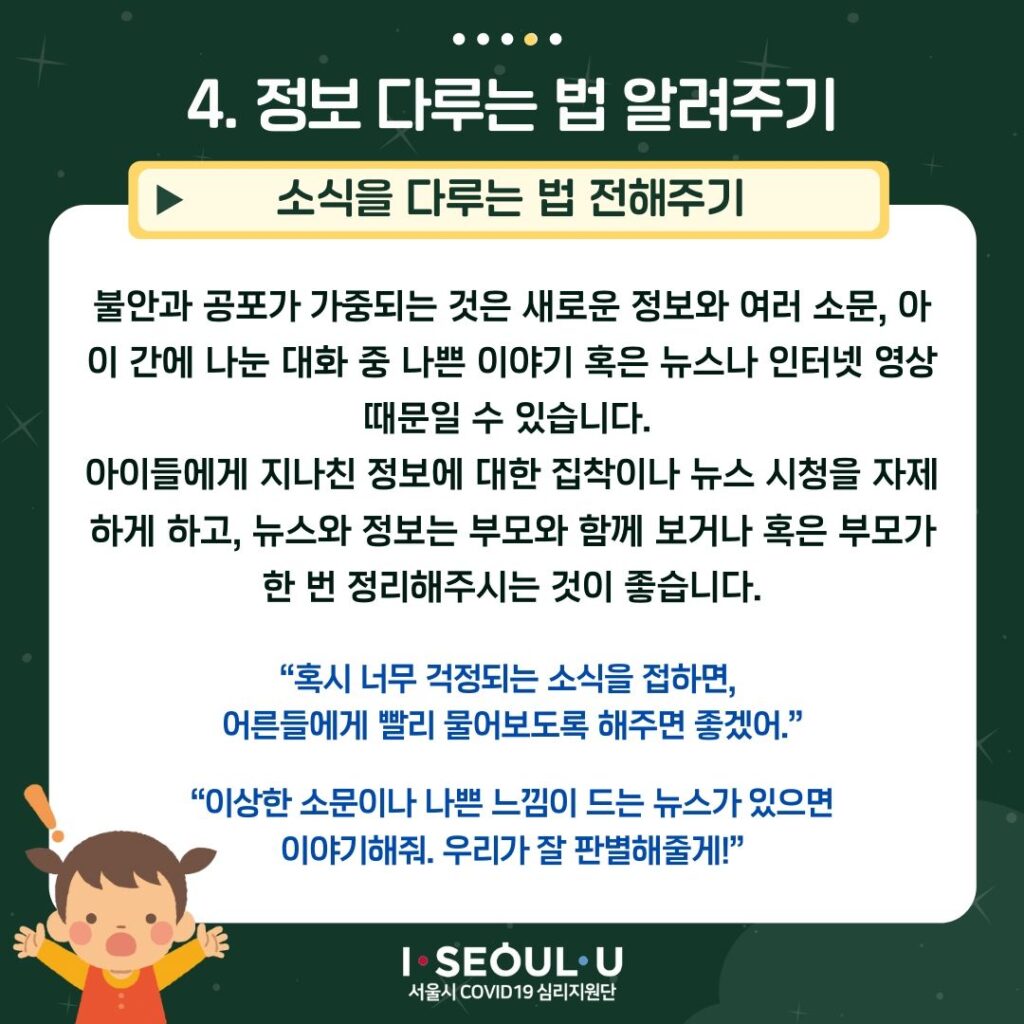 불안과 공포가 가중되는 것은 새로운 정보와 여러 소문, 아이 간에 나눈 대화 중 나쁜 이야기 혹은 뉴스나 인터넷 영상 때문일 수 있습니다. 아이들에게 지나친 정보에 대한 집착이나 뉴스 시청을 자제하게 하고, 뉴스와 정보는 부모와 함께 보거나 혹은 부모가 한 번 정리해주시는 것이 좋습니다.