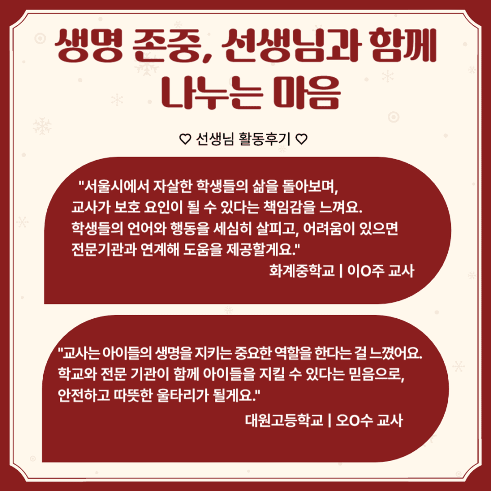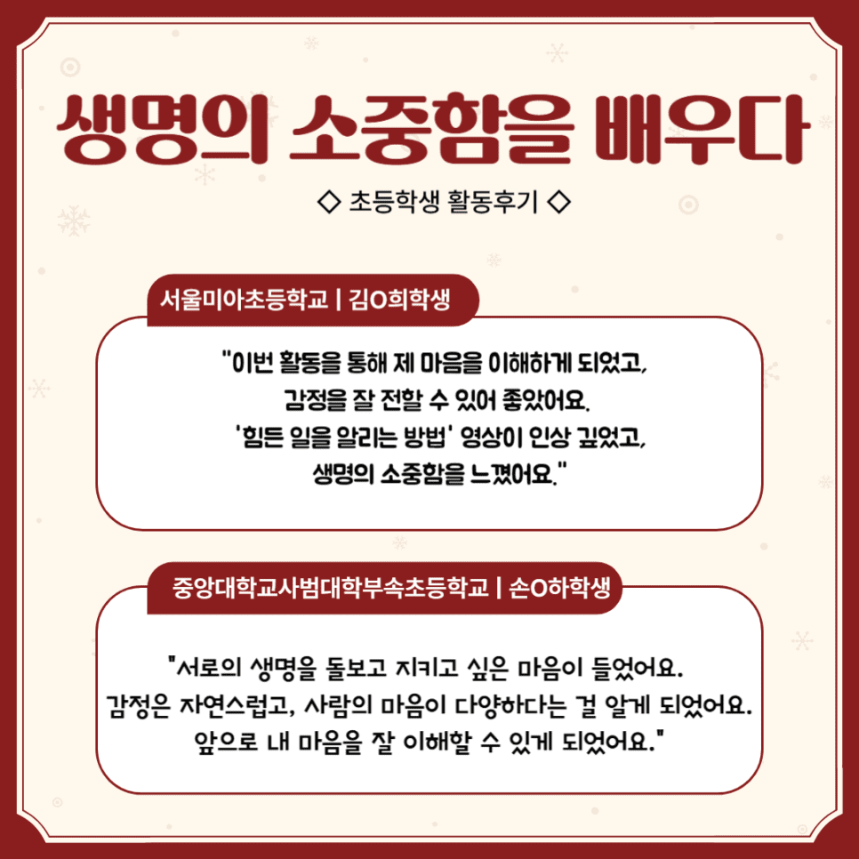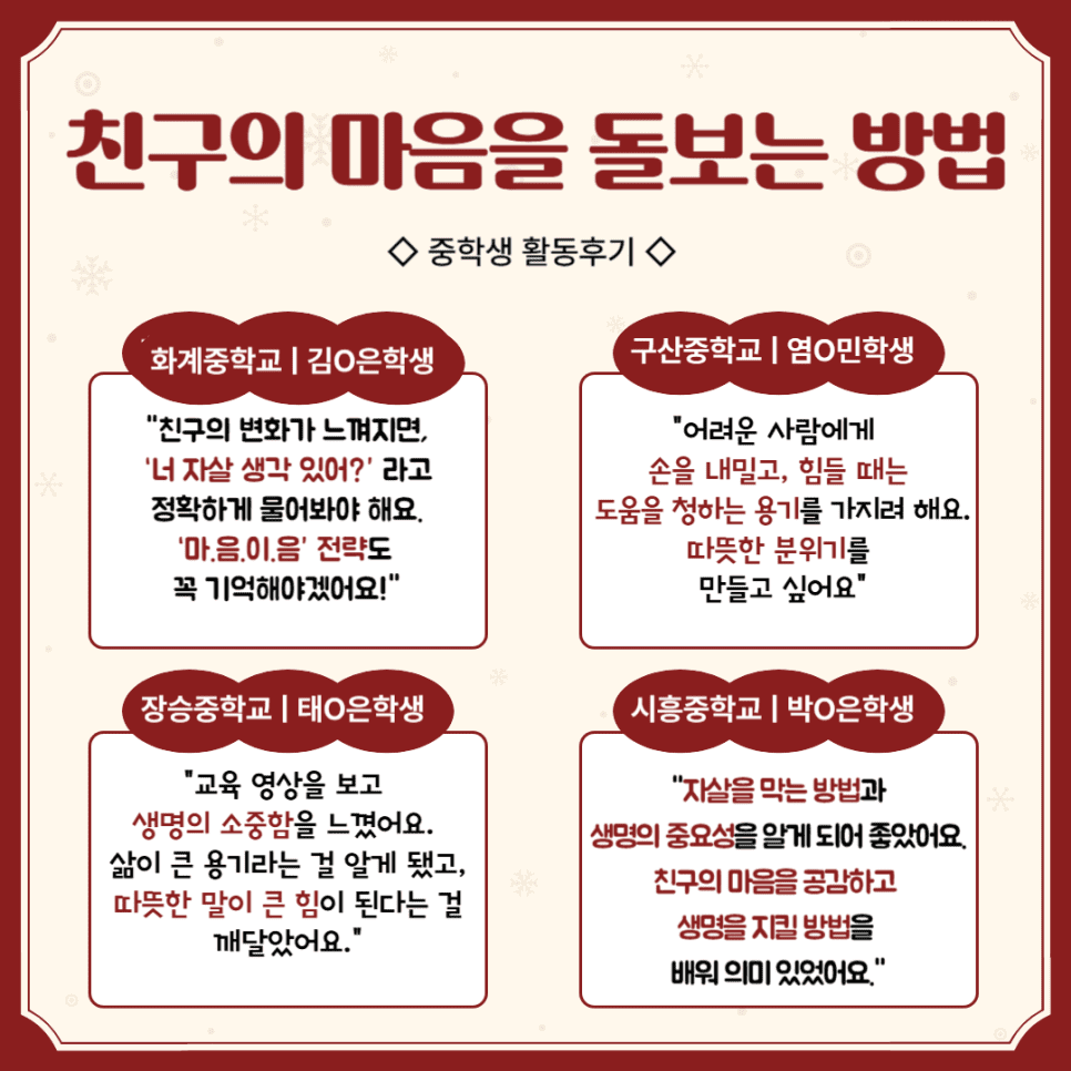 이를 통해 청소년들의 생명 존중에 대한 인식이 높아졌고, 자살 예방을 위한 실천적인 변화가 일어났습니다.