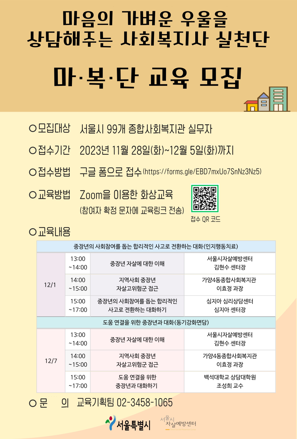 안녕하세요. 서울시자살예방센터 교육기획팀입니다. 본 설문은 [2023년 마음의 가벼운 우울을 상담해주는 사회복지사 실천단 마복단] 온라인교육 (12월) 참여 신청서입니다. 교육 참여를 원하시는 경우, 아래의 개인정보수집 동의와 모든 항목의 응답을 부탁드립니다. * 교육대상 : 서울시 종합사회복지관 실무자 * 모집인원 : 40명 내외 * 교육내용 : 중장년 자살의 이해와 접근 * 교육일시 : 2023년 12월 1일(금) 13:00~17:00 (인지행동치료) 2023년 12월 7일(목) 13:00~17:00 (동기강화상담) ※ [필수확…