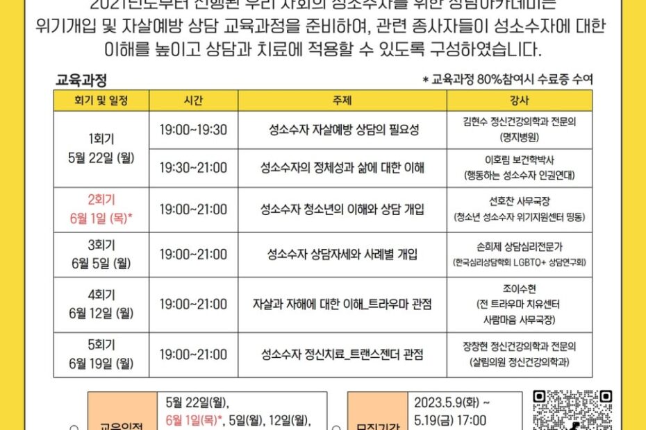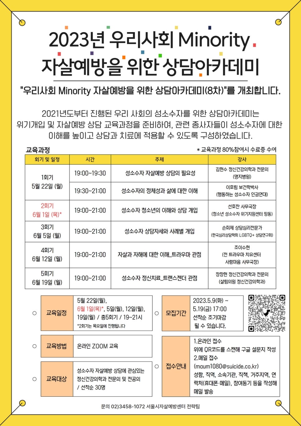 2023년 우리사회 Minority 자살예방을 위한 상담아카데미 (8차) 가 개최됩니다.