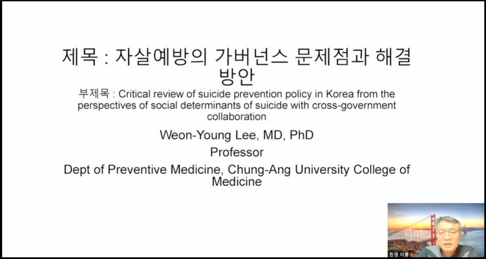 는 자살예방을 위해 보건학적 관점을 넘어 사회적 관점으로서의 접근의 필요성과 자살 예방사업에 있어 기관의 여러 부처 간의 적극적 협력이 필요하다고 언급하며 다시 한번 다학제적 자살예방 접근의 중요성을 강조하였습니다.