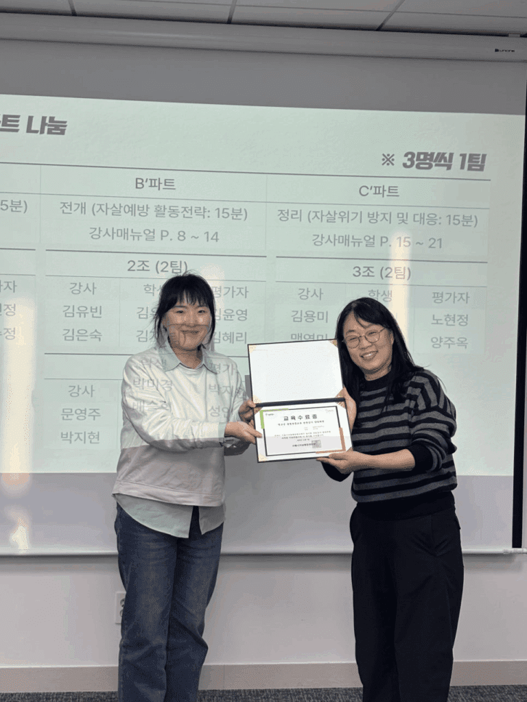 이를 바탕으로 전문강사를 양성하여 교내에서 자살예방 교육이 원활하게 이루어질 수 있도록 지원할 예정입니다.