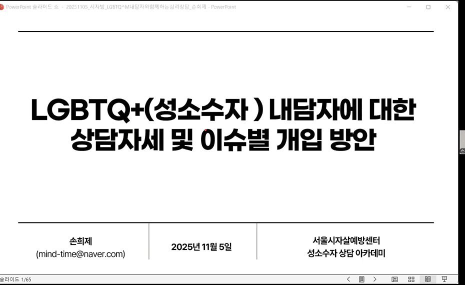 안녕하세요. 서울시자살예방센터 기획지원팀입니다 ! 2025년 10월 15일을 시작으로 11월 5일까지 매주 수요일 총 4회기의 ‘우리사회 Minority 자살예방을 위한 상담아카데미’ 14차 교육이 진행되었습니다. ‘우리사회 Minority… 더 보기 »‘우리사회 Minority 자살예방을 위한 상담아카데미’ 14차 교육 진행