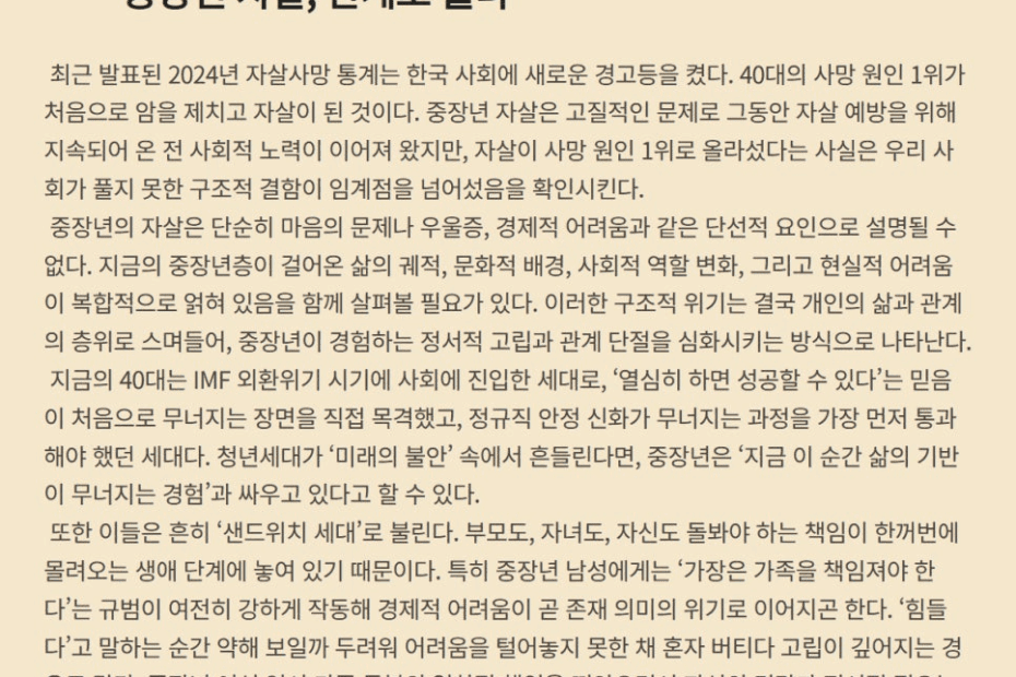안녕하세요. 서울시자살예방센터 유족지원팀입니다. 저희 센터는 자살 유족분들을 보다 세심하게 지원하기 위해, 각 자치구 정신건강복지센터 실무자분들을 직접 찾아가는 자살유족서비스 교육을 진행하고 있습니다. 11월에 진행된… 더 보기 »2025년 찾아가는 지역사회 자살유족서비스 교육