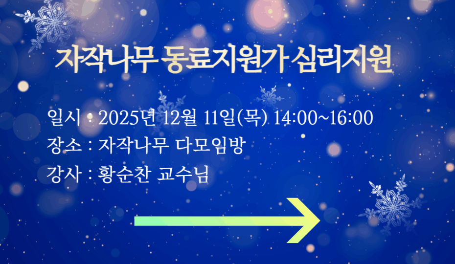 안녕하세요 서울시자살예방센터입니다. 서울시자살예방센터에서는 지난 12월 4일(목), 12월 11일(목) 이틀에 걸쳐 자작나무 동료지원가 심리지원이 진행되었습니다. 심리지원은 황순찬 교수님(인하대학교 사회복지학과)께서 함께 해주셨습니다. 이번 심리지원에서는 동료지원가 활동… 더 보기 »자작나무 동료지원가 심리지원(1,2차)