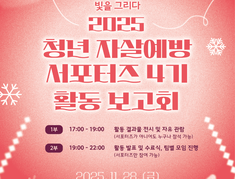 안녕하세요, 서울시자살예방센터 입니다. 5개월 동안 다양한 활동과 성장을 이어온 청년 자살예방 서포터즈 4기의 여정을 마무리하며, 그동안의 노력을 함께 나누는 활동보고회를 개최합니다. ?5개월간의 서포터즈 활동을 마무리… 더 보기 »2025 청년 자살예방 서포터즈 4기 활동보고회 사전 신청 안내