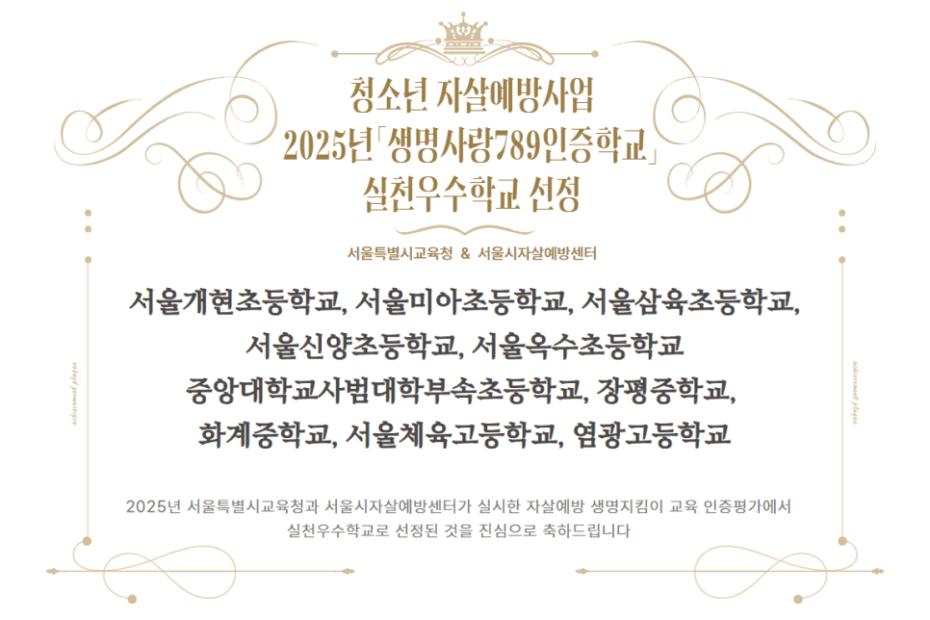 안녕하세요, 서울시자살예방센터입니다! 서울시자살예방센터는 서울시교육청과 협력하여 서울시 내 30개 학교를 2025 생명사랑789인증학교로 선정하고, 4월부터 10월까지 자살예방 교육과 활동을 진행해왔습니다. 이번 활동은 학생들의 생명존중 의식을 높이고, 자살… 더 보기 »[청소년자살예방] ‘2025 생명사랑789인증학교’ 실천우수학교 10교 선정