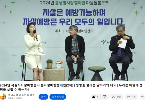 ?2024 봄생명사랑캠페인, <중장년의 우울 및 자살 예방>에 여러분을 초대합니다 ! ? 중장년의 자살 예방 실천 방안에 대해 이야기해보고 봄철 스프링피크를 현상을 예방하는 생명존중문화 시간을 가져봐요. ?일시: 05월 30일(목) 18:30~20:00 ?접수 기간: ~05월 29일(수) 24:00 ?대상 – 자살 문제에 관심이 있는 시민 – 마음건강에 관심이 있는 시민 – 자살예방사업 및 유관기관 관계자 ?진행 방법 – 오프라인 참여 및 유튜브 온라인 실시간 생중계 진행 ※ 온라인 참여 링크는 추후 안내드릴 예정입니다….
